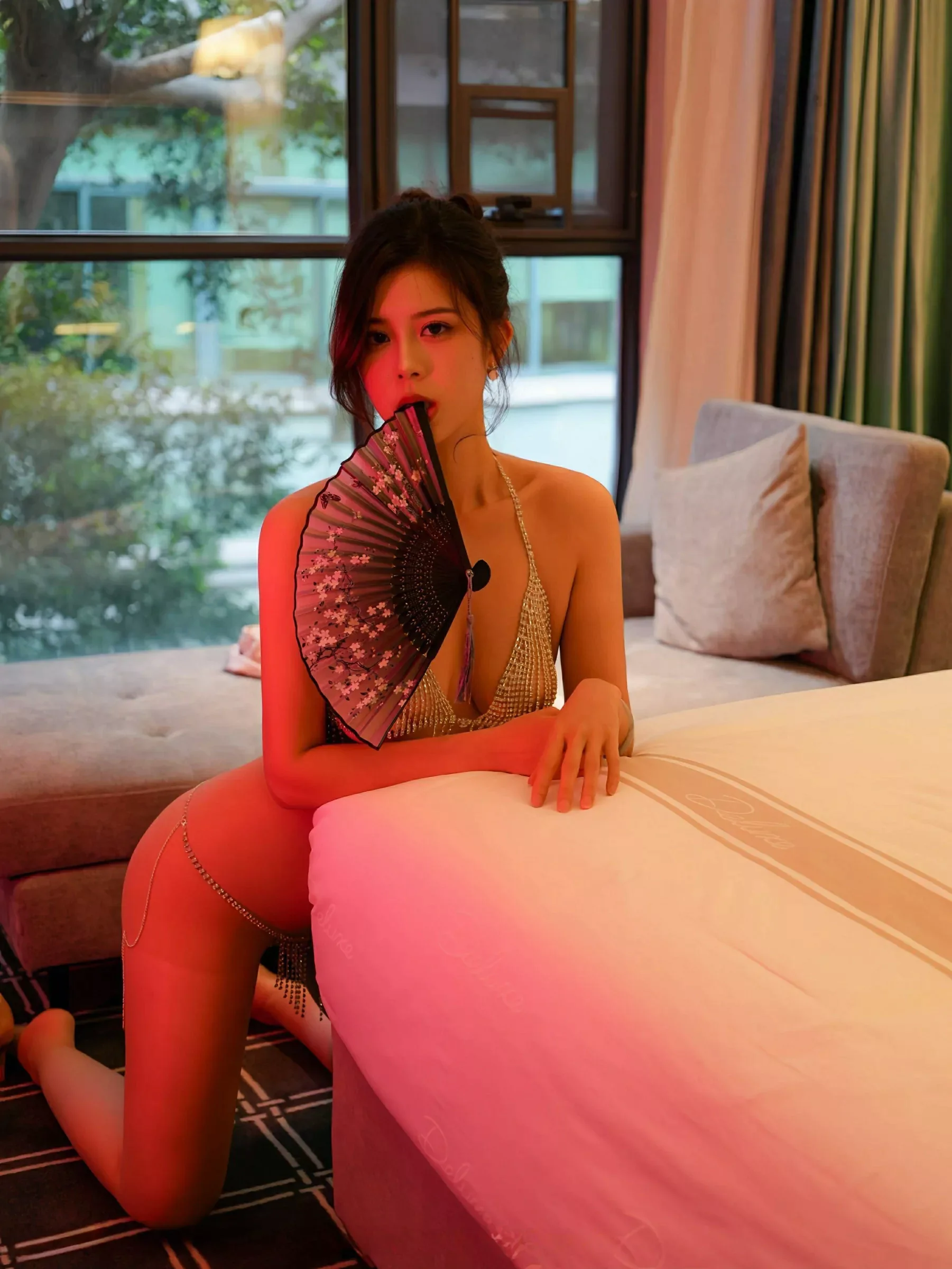 在第三组"暮光女神"创作中,灯光师布置了六盏2400W钨丝灯营造暖黄昏晕。玫瑰我爱你身着酒红色丝绒斗篷侧卧在复古雕花榻上,发型师用电卷棒做出慵懒的睡不醒头,每缕发丝都喷洒了含云母粉的定型喷雾。当夕阳坠入地平线那刻,助理同时点燃了薰衣草干枝与橙片,烟雾在背景中形成层次丰富的香氛帷幕。摄影师抓住模特回眸的刹那,85mm镜头完美捕捉到眼中倒映的晚霞,后期通过频率分离处理保留了肌肤质感的同时,让斗篷的丝绒纹理呈现出天鹅绒般的视觉效果。
